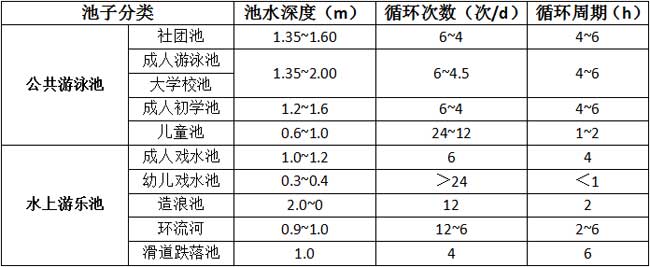 游泳池由于用途不同而循環周期也會不相同;水上游樂池也是因為其用途的不同循環周期也不同。除了用途,也包括泳池的水深、泳池負荷等因素確定循環周期。或如下表: